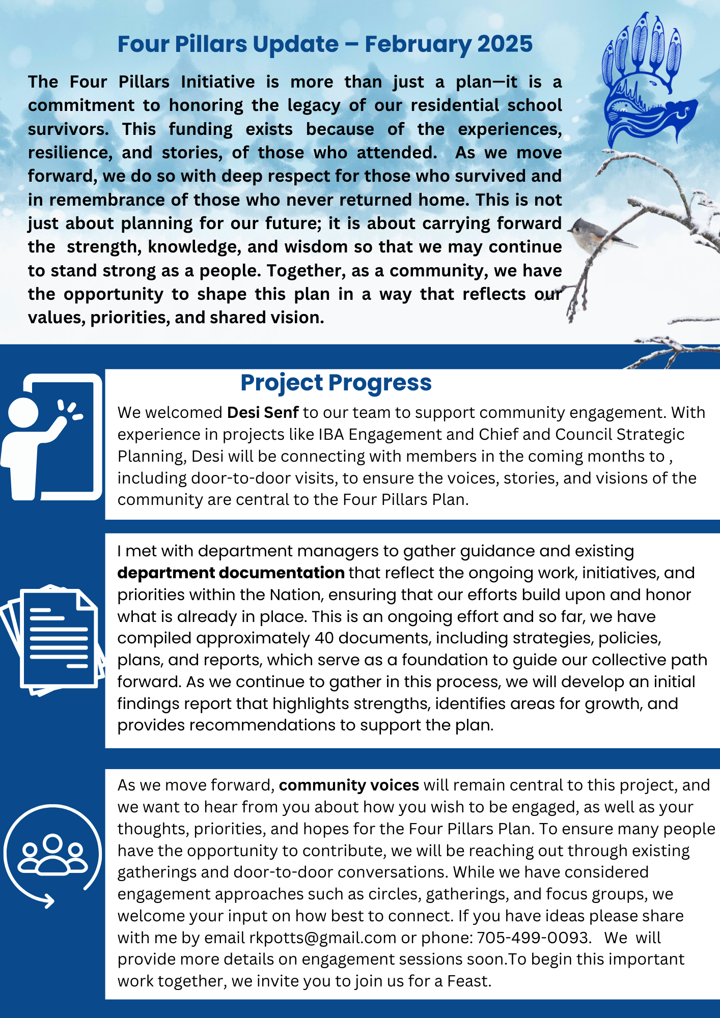 We look forward to hearing your thoughts and perspectives as we continue building the four pillars community plan. Miigwetch!